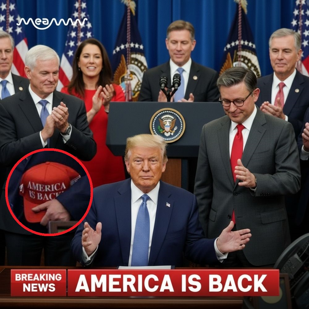 The hat, bearing the phrase “America Is Back!” sat on the Resolute Desk in the Oval Office during the bill-signing ceremony, as House Speaker Mike Johnson praised the message while standing alongside the president.